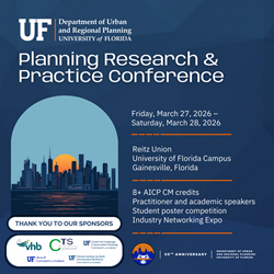 Join us for the University of Florida’s Planning Research & Practice Conference, a two-day event hosted by the Department of Urban and Regional Planning. This conference brings together researchers, practitioners, students, and industry leaders to explore the ideas, innovations, and real-world applications shaping the future of planning.